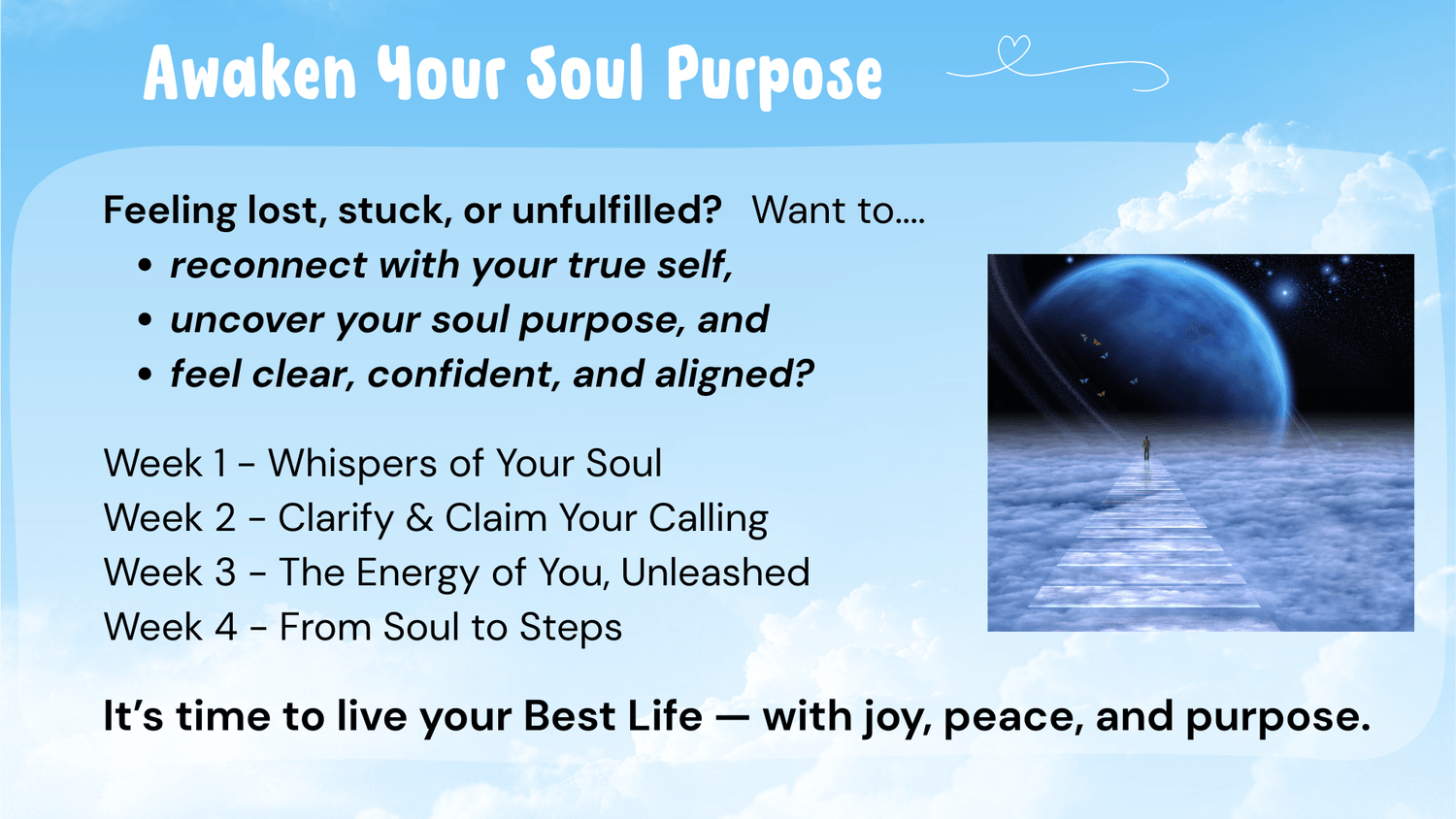 Welcome to Awaken Your Soul Purpose — a course to help you remember who you truly are, why you're here, and how to live a life that feels light, meaningful, and deeply fulfilling.