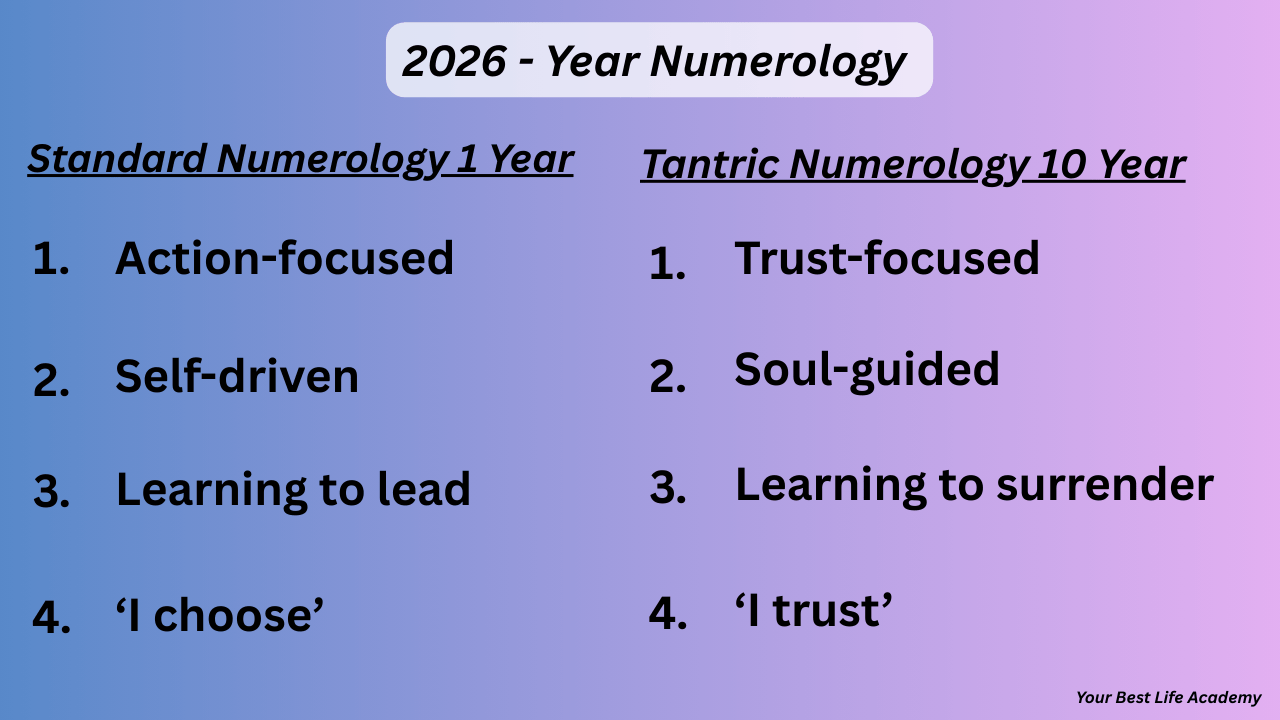 In this blog post, we explore what it means that 2026 is a 1 Year in standard numerology and a 10 Year in tantric numerology, how these energies work together, and how you can use them to make aligned choices, reduce self-doubt, and move forward with more confidence and ease — not just in 2026, but in the years ahead.