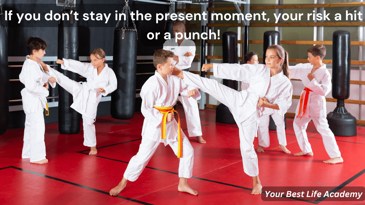 Mindfulness isn’t just about sitting still and meditating — it’s about being fully present, in the moment, in whatever you’re doing. Whether you’re practicing karate, talking to someone, or just going through your daily routine, mindfulness is about giving your full attention to the present moment.