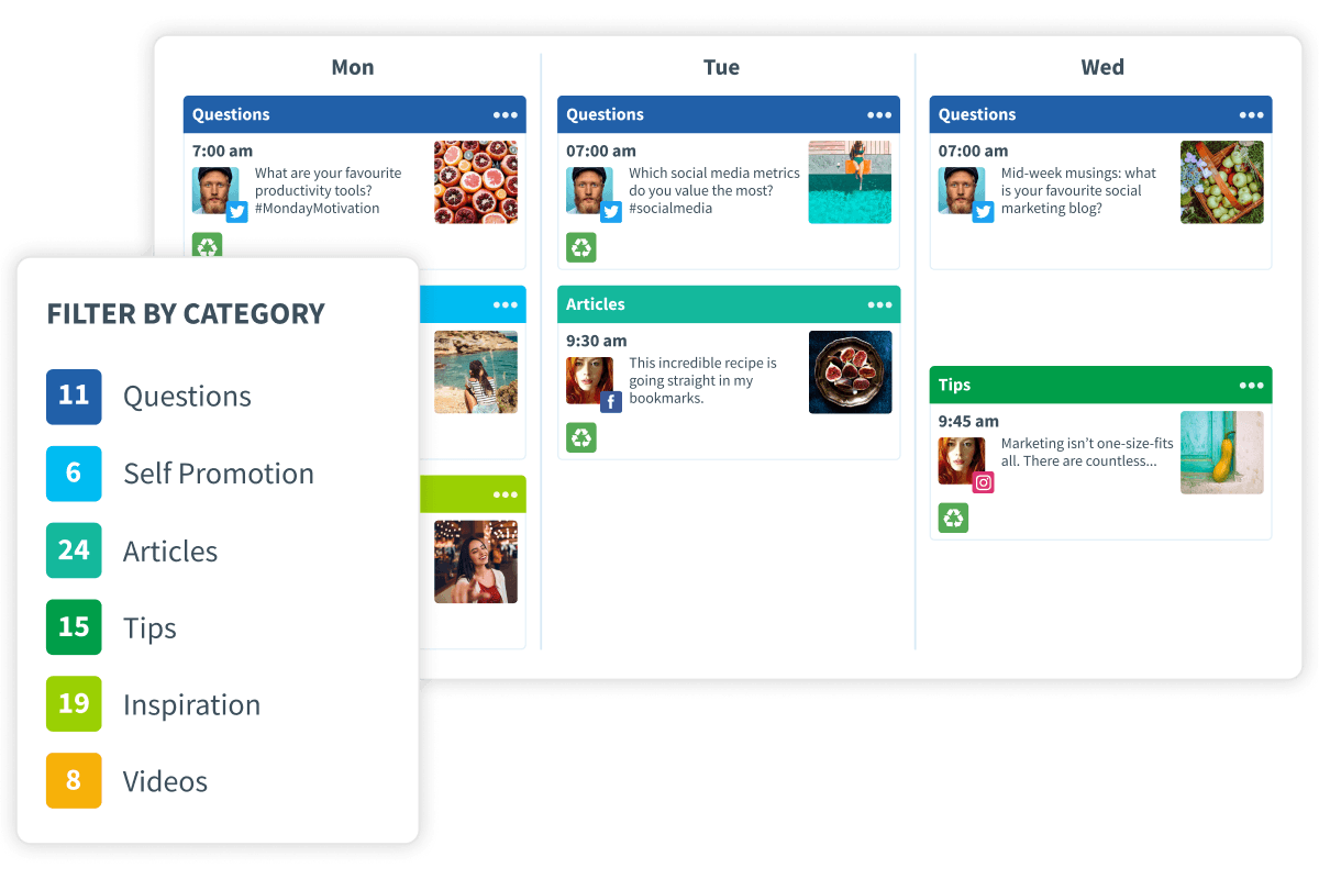 SmarterQueue lets you organize your content into categories (like tips, promotions, or quotes), and it automatically rotates your posts based on your plan. This makes it easy to stay consistent and share a variety of content that engages your audience — without worrying about what to post next.