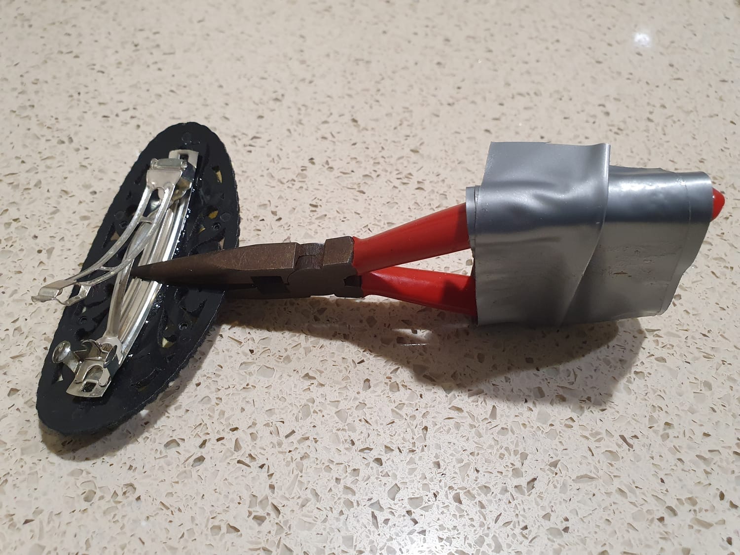 When my favourite hairclip broke recently, I asked my cousin if he could fix it for me, as I wanted to keep using it if possible, and wasn't quite sure how to go about it. He asked for various tools, however we didn’t have access to them where I was (at Mum’s place). So we used a bit of ingenuity, and items we already had around the house. Voilà! Problem solved.